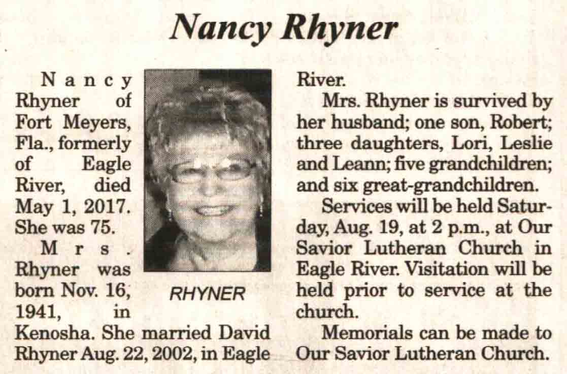 | Rhyner | Nancy | 16 Nov 1941 | 01 May 2017 | V N-R | 09 Aug 2017 | 4A |