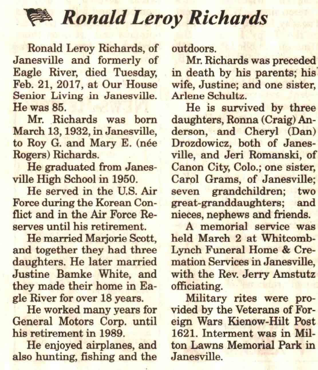 | Richards | Ronald Leroy | 13 Mar 1932 | 21 Feb 2017 | V N-R | 08 Mar 2017 | 4A |