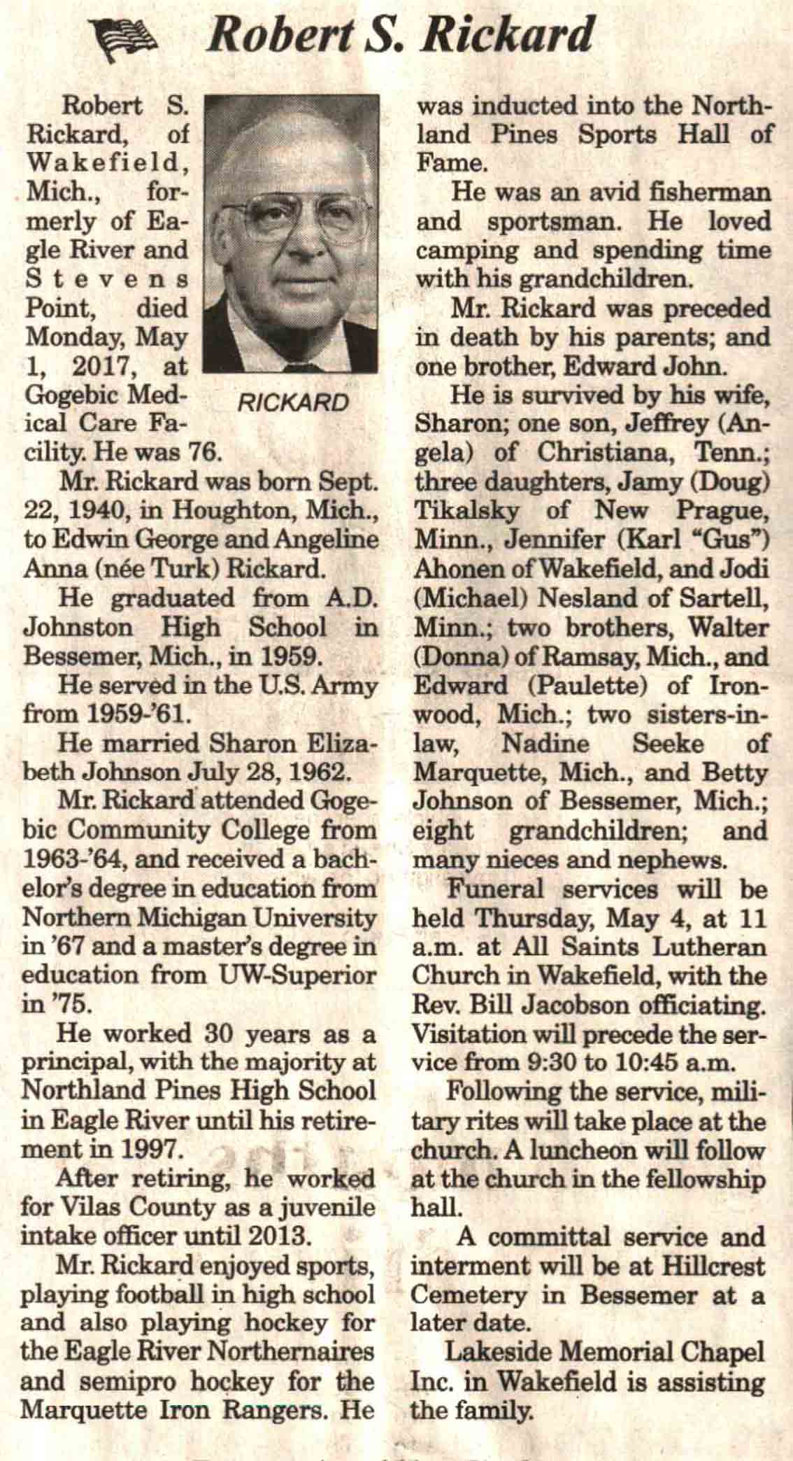 | Rickard | Robert S | 22 Sep 1940 | 01 May 2017 | V N-R | 03 May 2017 | 4 |