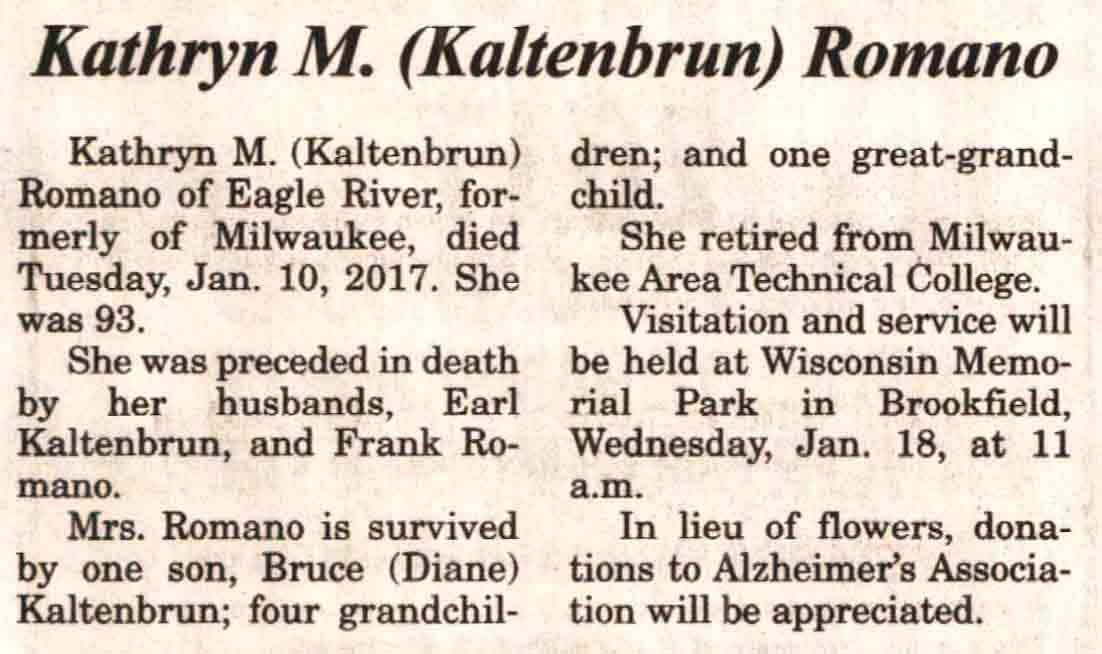 | Romano | Kathryn M | c 1924 | 10 Jan 2017 | V N-R | 18 Jan 2017 | 5A |