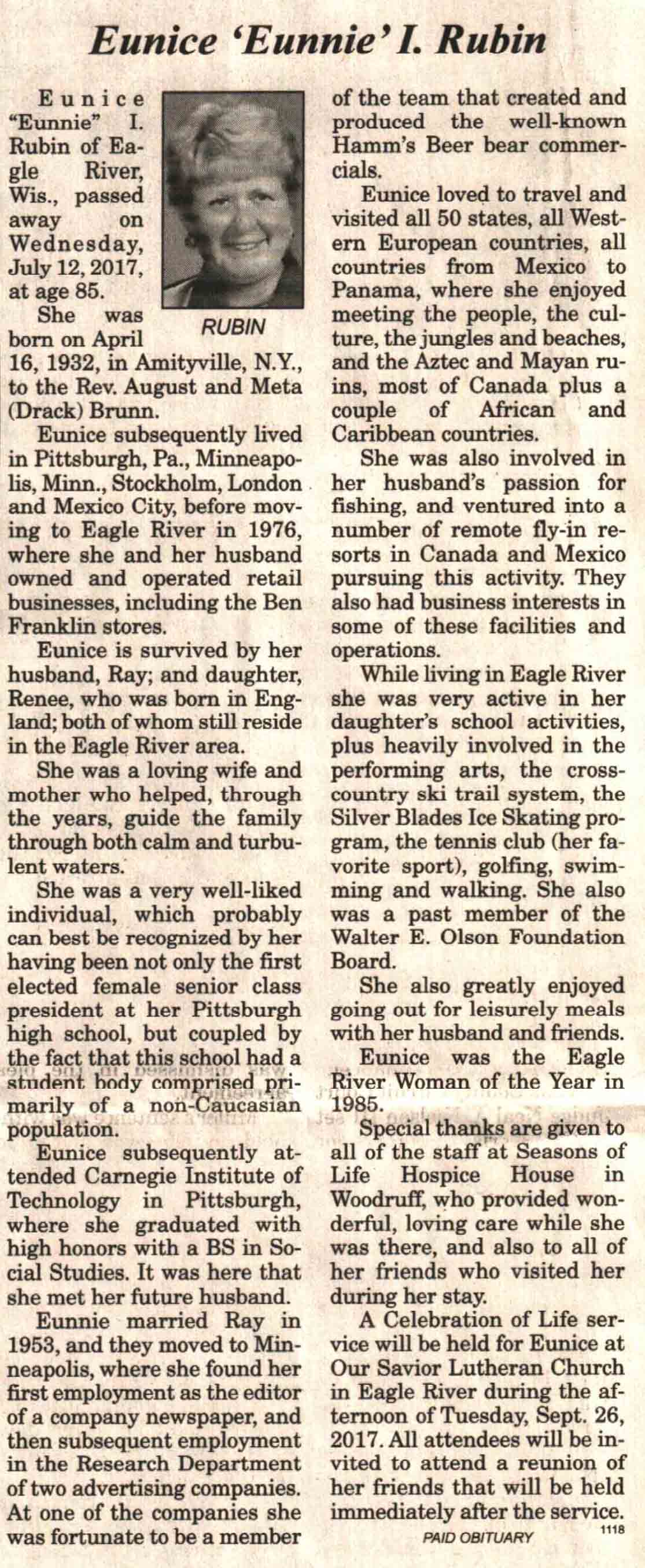 | Rubin | Eunice I 'Eunnie' (Brunn) | 16 Apr 1932 | 12 Jul 2017 | V N-R | 19 Jul 2017 | 4A |