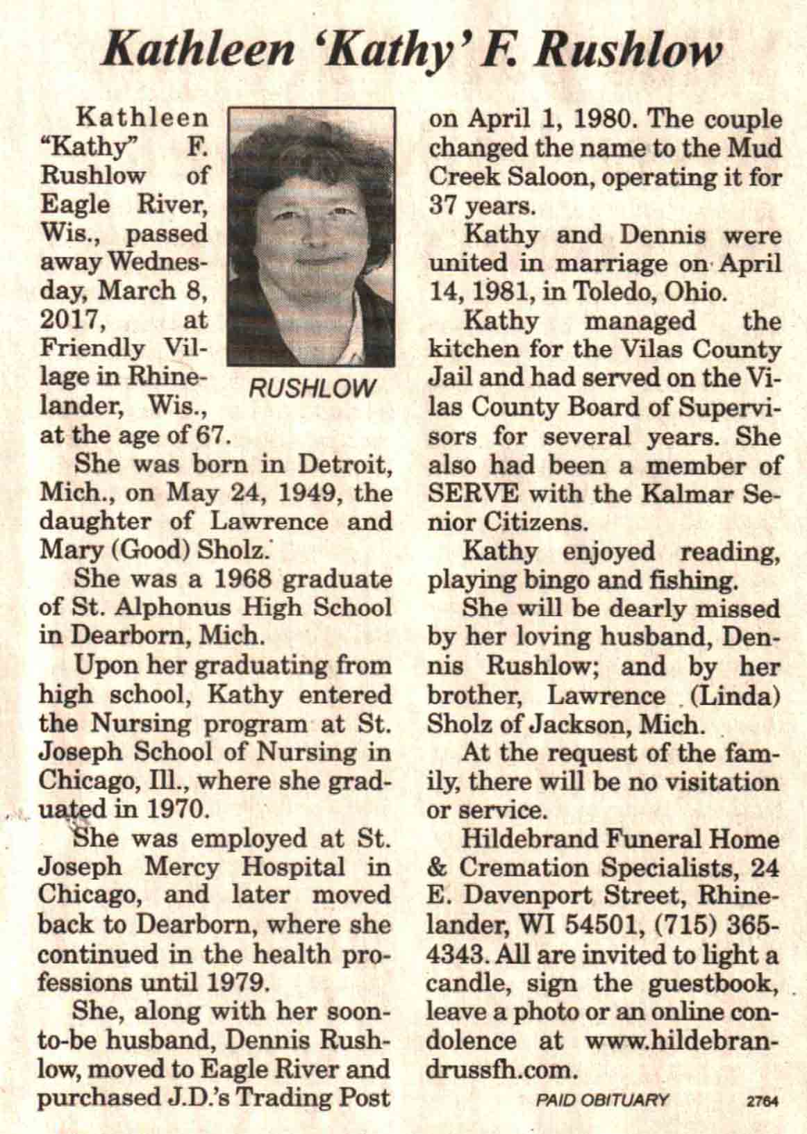 | Rushlow | Kathleen F 'Kathy' (Sholz) | 24 May 1949 | 08 Mar 2017 | V N-R | 15 Mar 2017 | 4 |