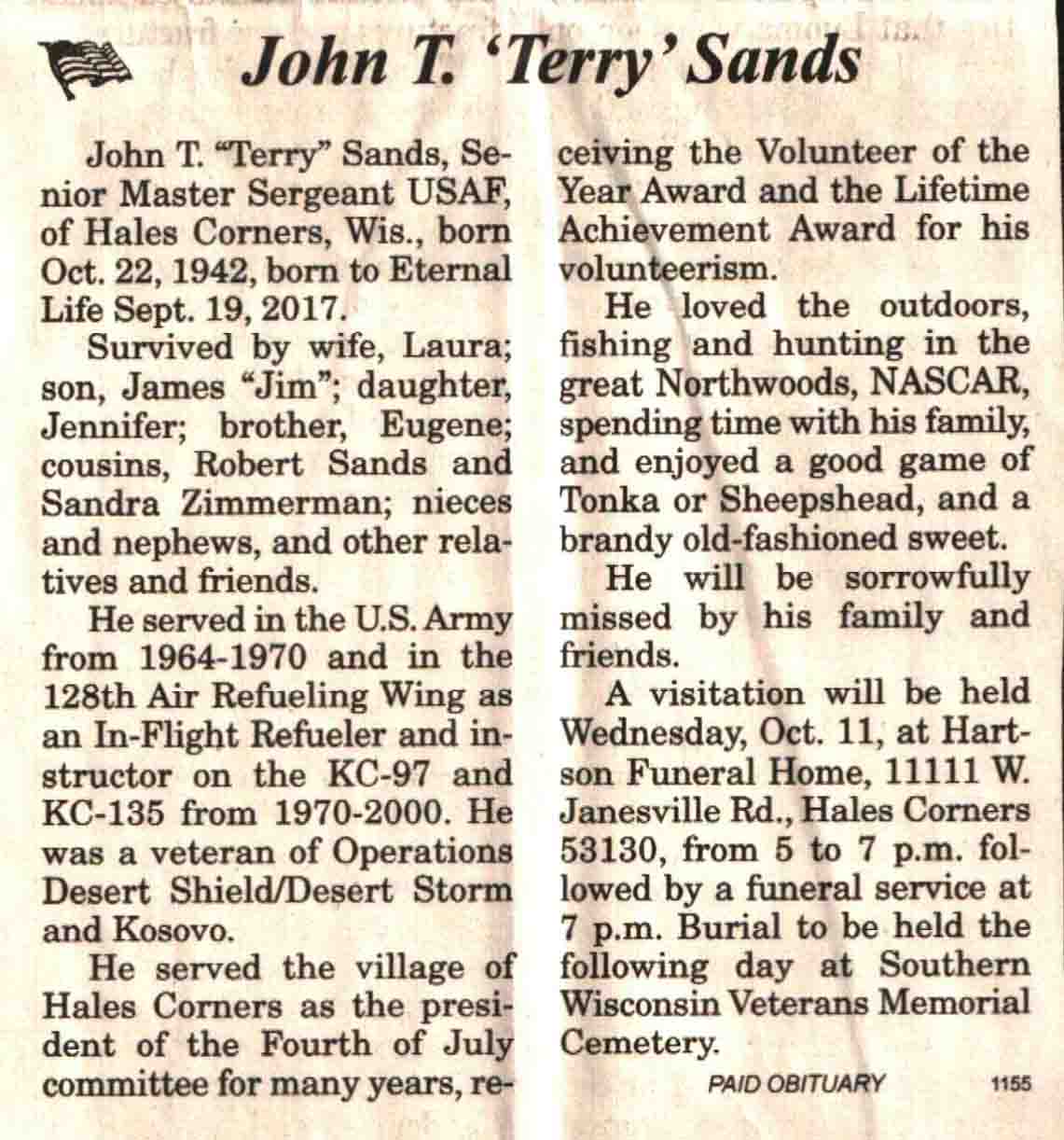 | Sands | John T 'Terry' | 22 Oct 1942 | 19 Sep 2017 | V N-R | 04 Oct 2017 | 4A |