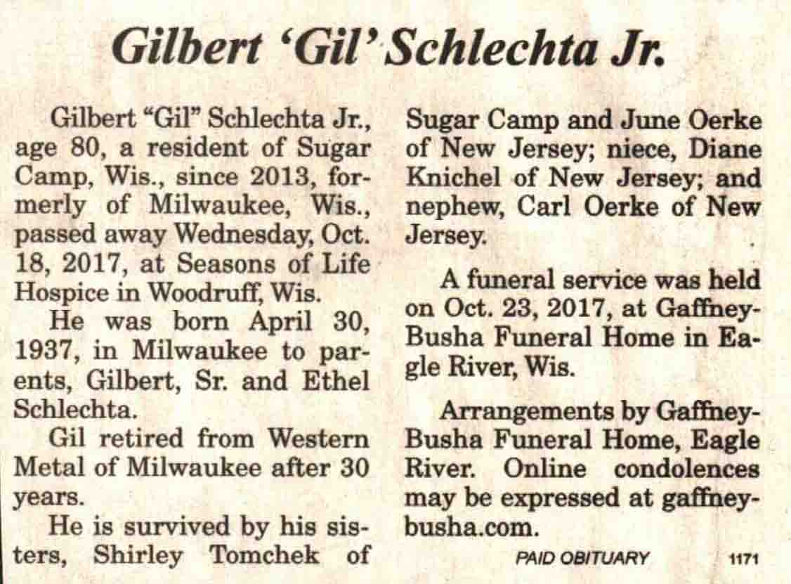 | Schlechta | Gilbert, Jr 'Gil' | 30 Apr 1937 | 18 Oct 2017 | V N-R | 25 Oct 2017 | 4 |