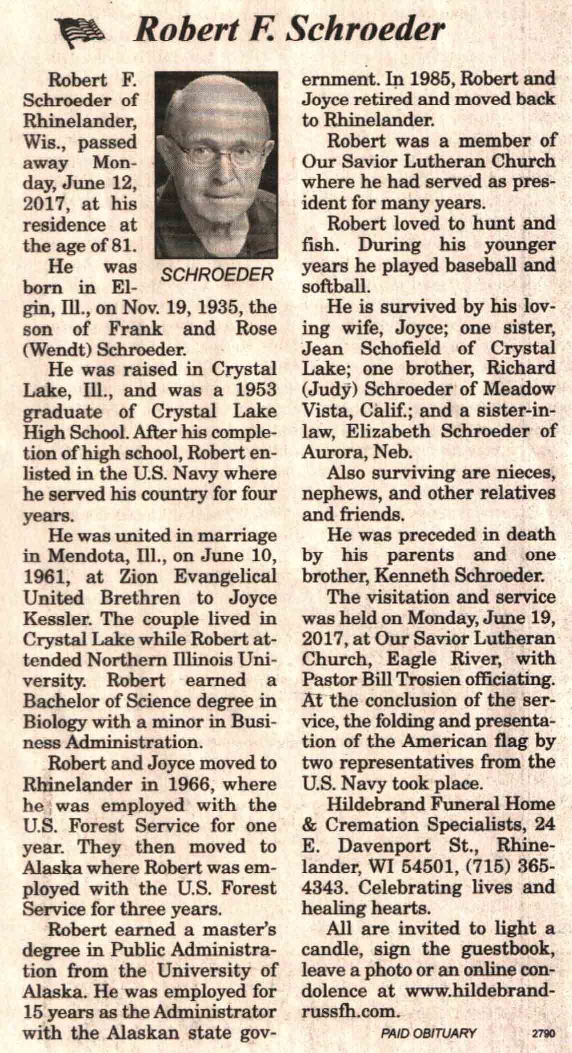 | Schroeder | Robert F | 19 Nov 1935 | 12 Jun 2017 | V N-R | 21 Jun 2017 | 4A |