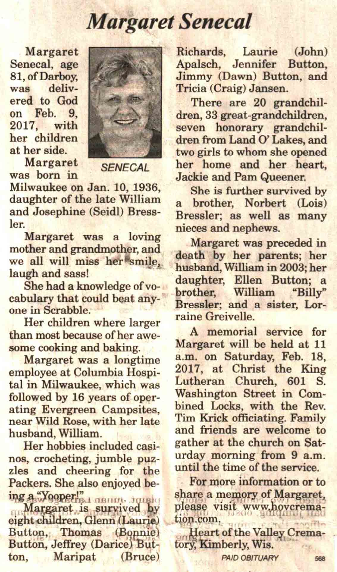 | Senecal | Margaret | 10 Jan 1936 | 09 Feb 2017 | V N-R | 15 Feb 2017 | 4 |