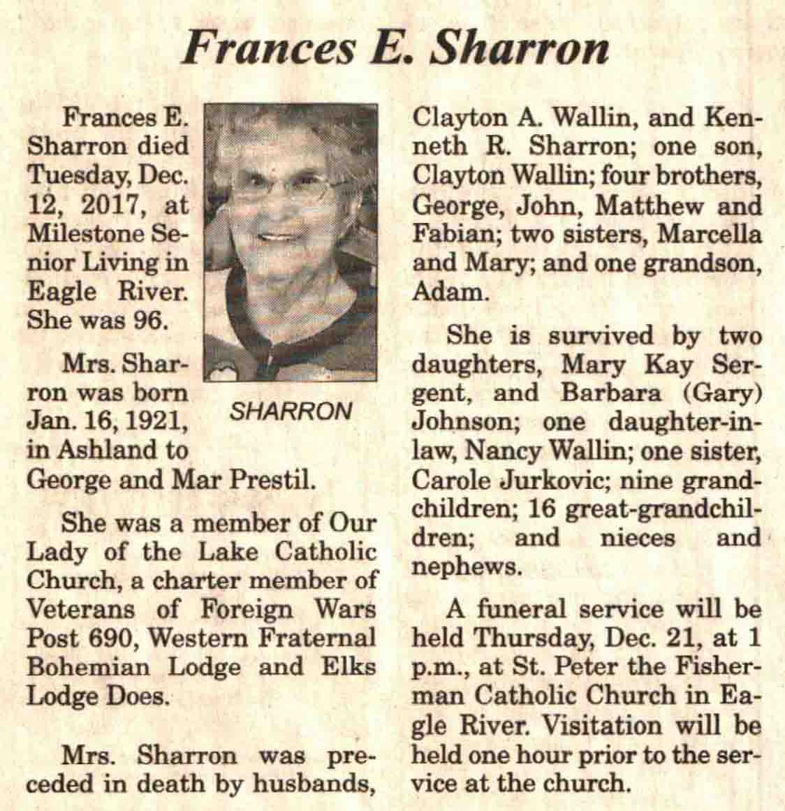 | Sharron | Frances E (Prestil) | 16 Jan 1921 | 12 Dec 2017 | V N-R | 20 Dec 2017 | 4 |