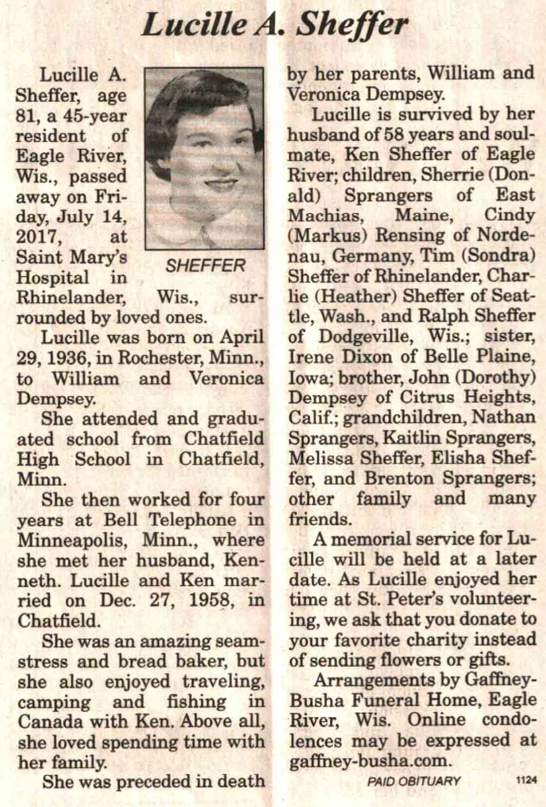 | Sheffer | Lucille A (Dempsey) | 29 Apr 1936 | 14 Jul 2017 | V N-R | 19 Jul 2017 | 4A |