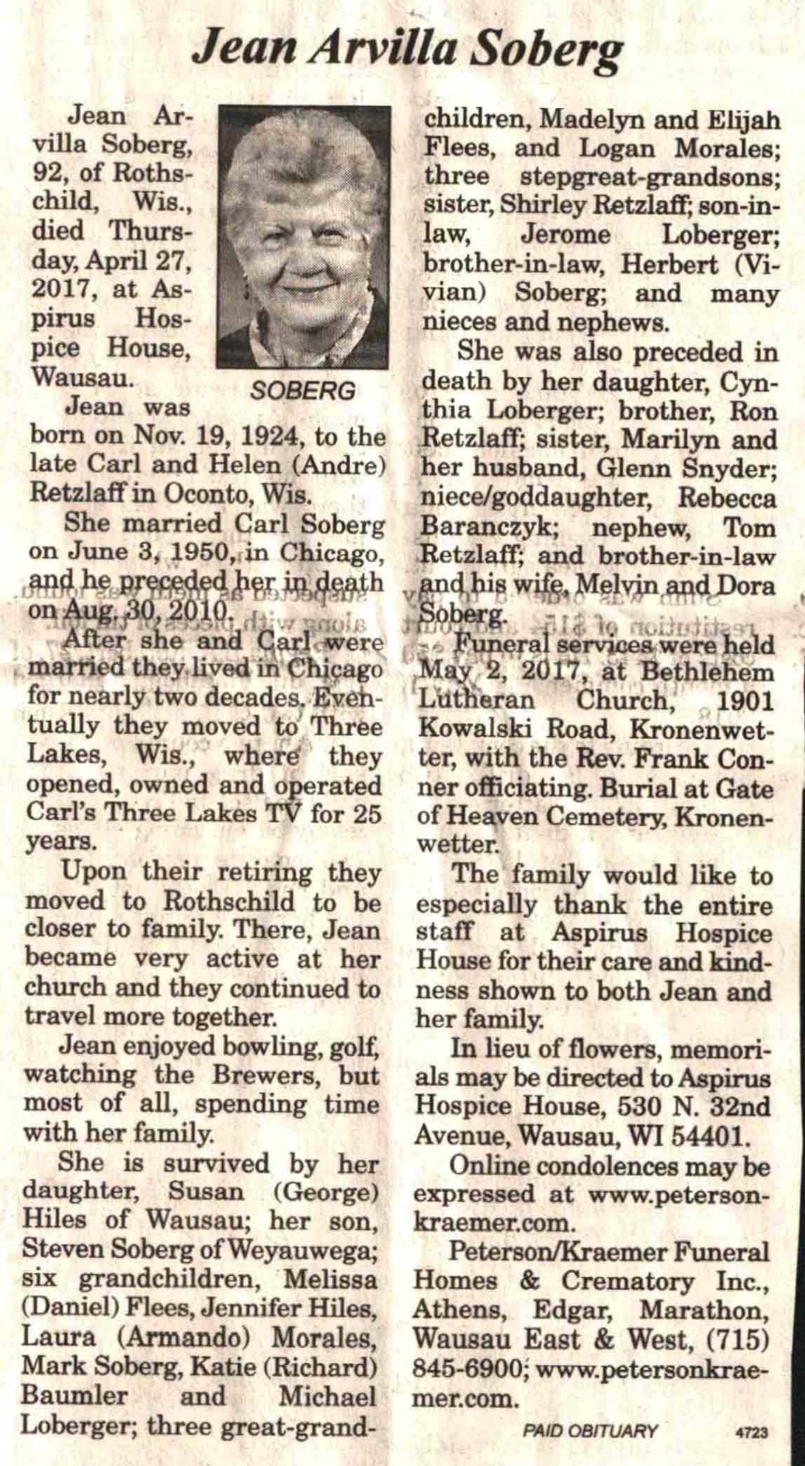 | Soberg | Jean Arvilla (Retzlaff) | 19 Nov 1924 | 27 Apr 2017 | V N-R | 03 May 2017 | 4 |