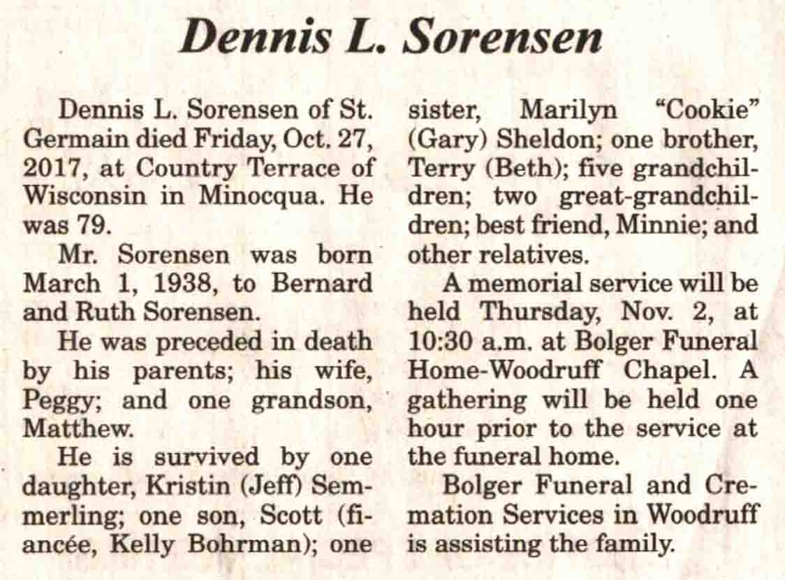 | Sorensen | Dennis L | 01 Mar 1938 | 27 Oct 2017 | V N-R | 01 Nov 2017 | 4A |
