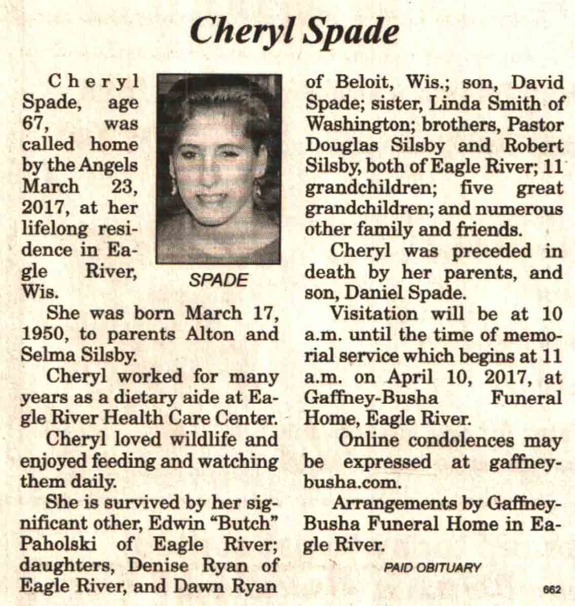 | Spade | Cheryl (Silsby) | 17 Mar 1950 | 23 Mar 2017 | V N-R | 05 Apr 2017 | 4 |