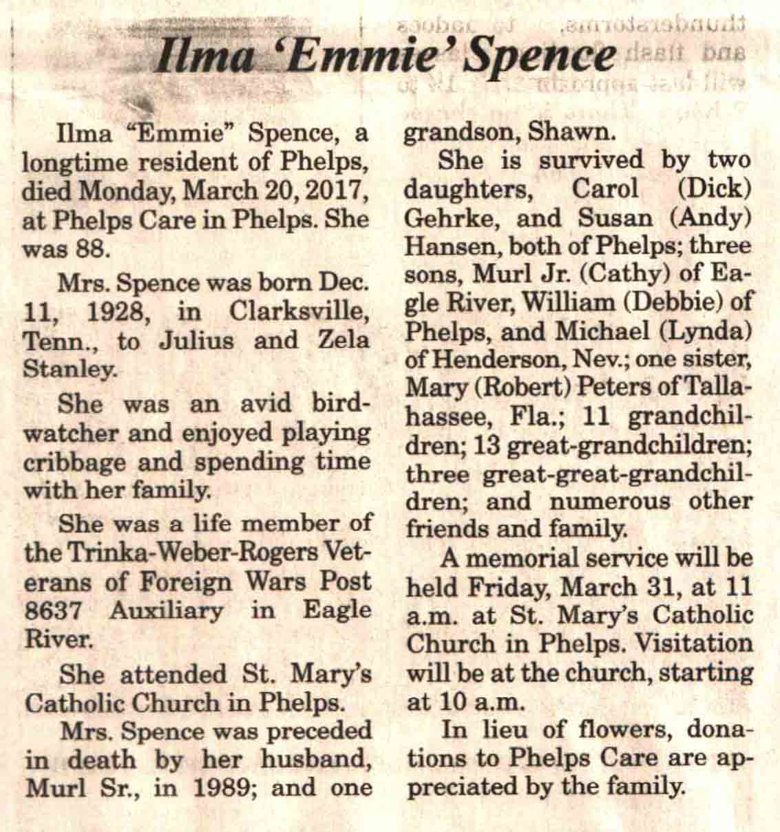 | Spence | Ilma 'Emmie' (Stanley) | 11 Dec 1928 | 20 Mar 2017 | V N-R | 29 Mar 2017 | 4A |