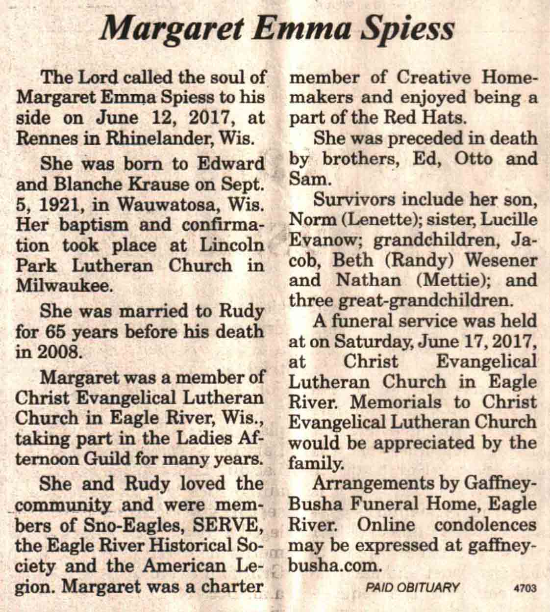| Spiess | Margaret Emma (Krause) | 05 Sep 1921 | 12 Jun 2017 | V N-R | 21 Jun 2017 | 4A |