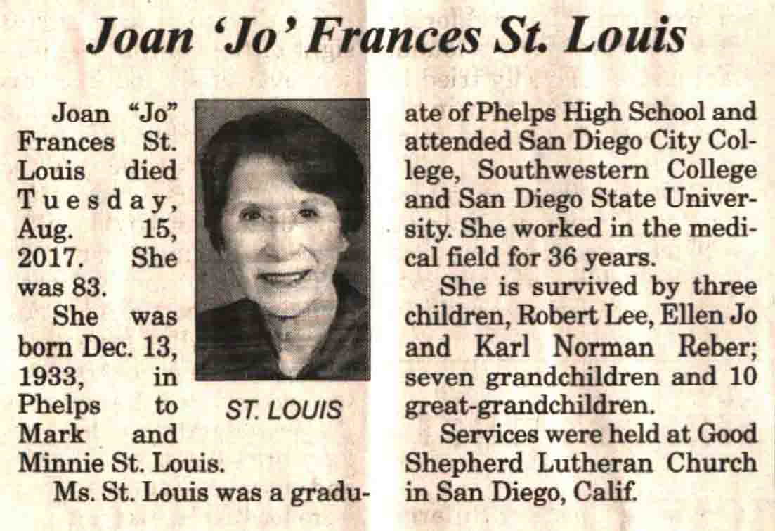 | St. Louis | Joan Francis 'Jo' | 13 Dec 1933 | 15 Aug 2017 | V N-R | 30 Aug 2017 | 4A |