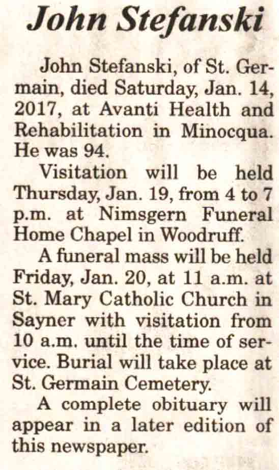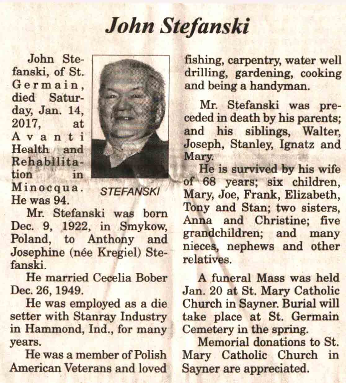| Stefanski | John #1 | 09 Dec 1922 | 14 Jan 2017 | V N-R | 18 Jan 2017 | 5A |
