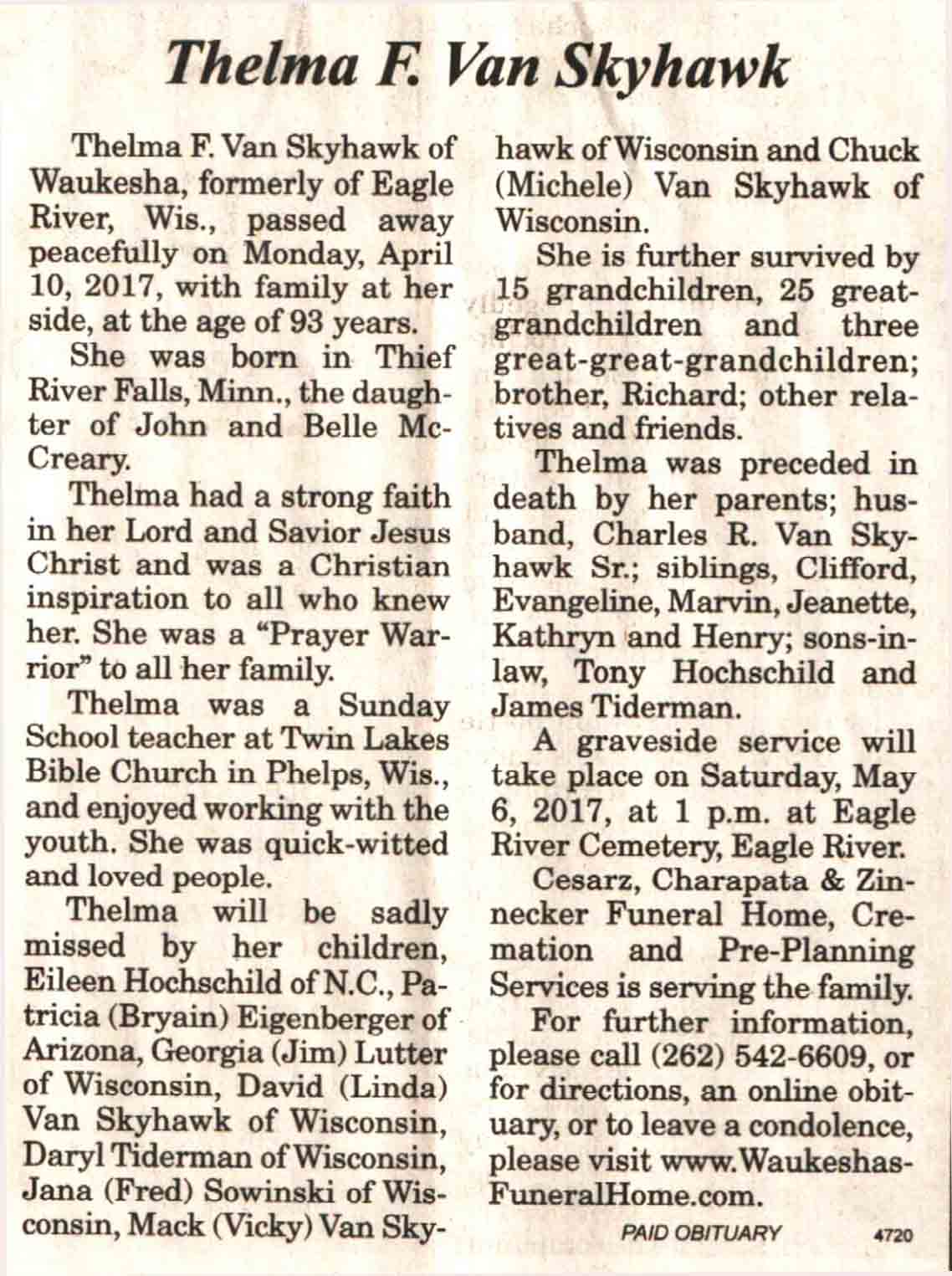 | Van Skyhawk | Thelma F (McCreary) | c 1924 | 10 Apr 2017 | V N-R | 26 Apr 2017 | 4A |
