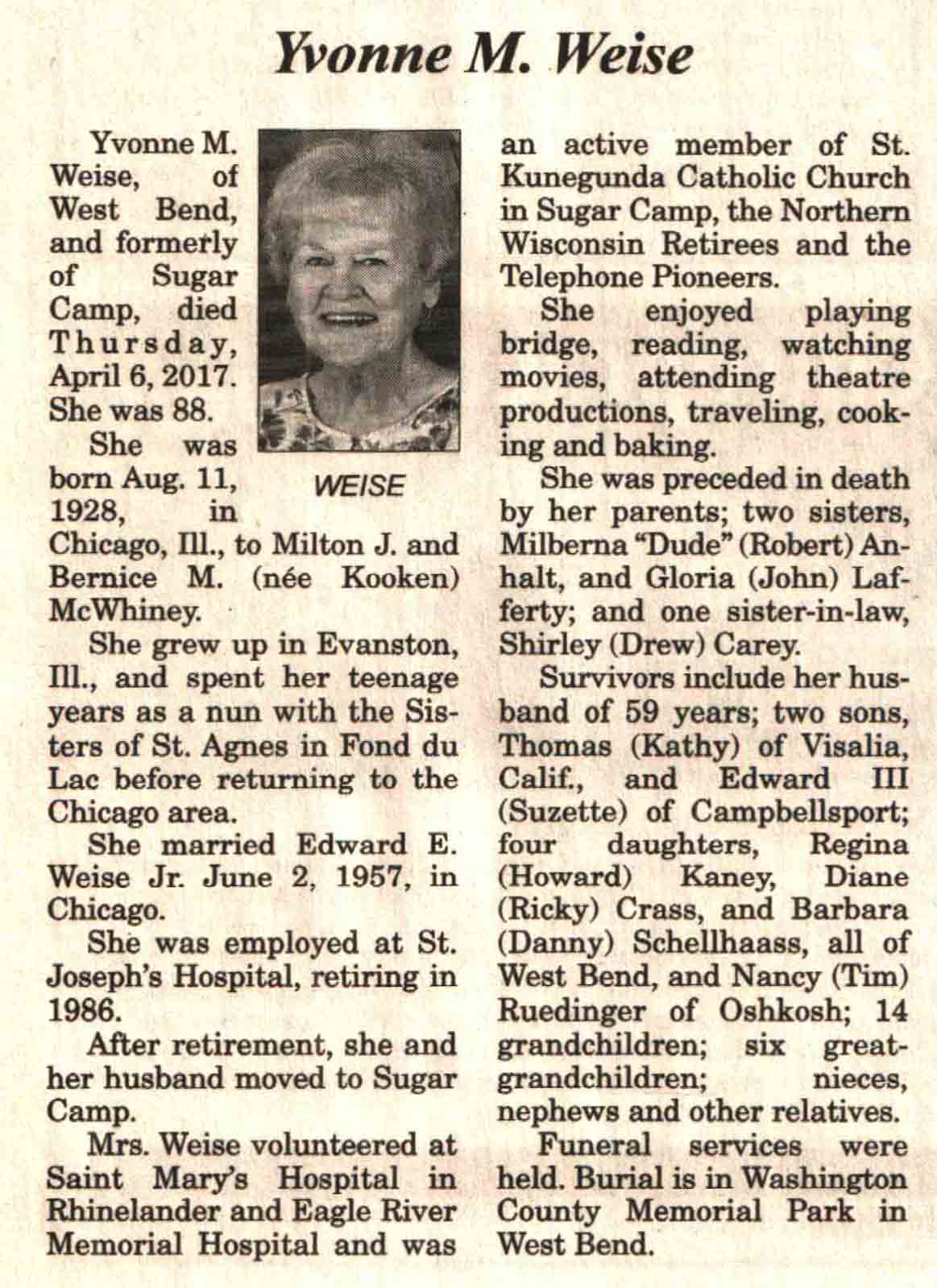 | Weise | Yvonne M (Kooken) | 11 Aug 1928 | 06 Apr 2017 | V N-R | 12 Apr 2017 | 4 |