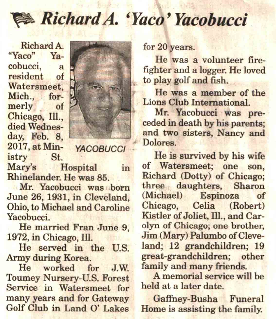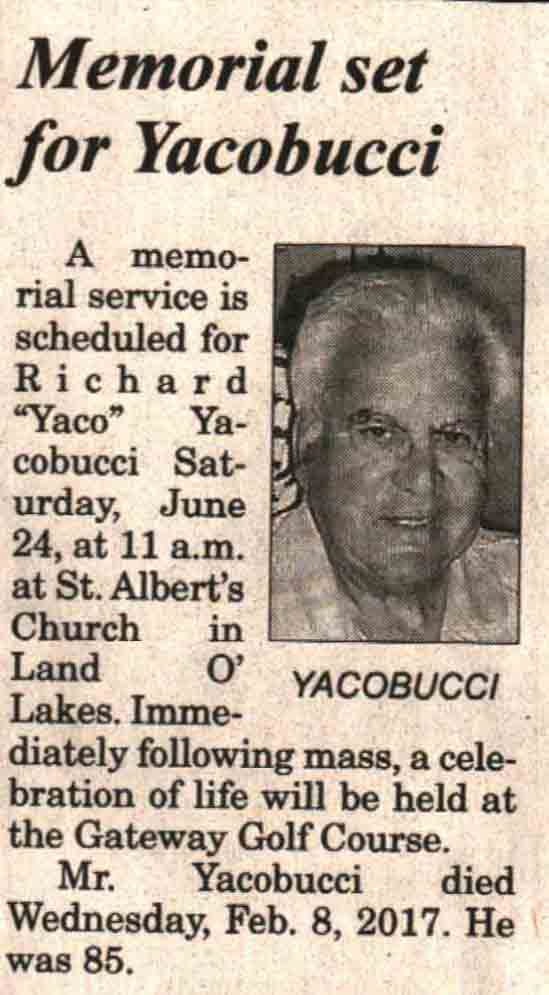 | Yacobucci | Richard A 'Yaco' #1 | 26 Jun 1931 | 08 Feb 2017 | V N-R | 15 Feb 2017 | 4 |