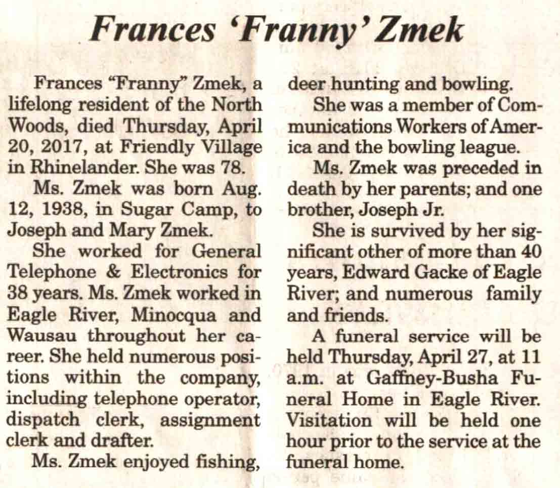 | Zmek | Frances 'Fanny' | 12 Aug 1938 | 20 Apr 2017 | V N-R | 26 Apr 2017 | 4A |