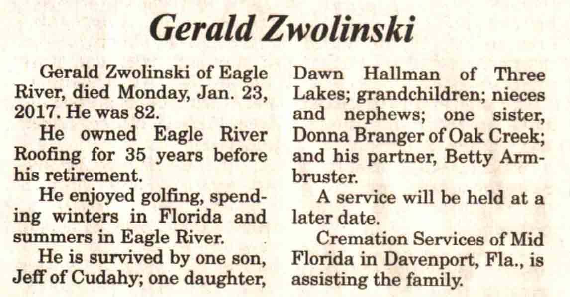 | Zwolinski | Gerald | c 1935 | 23 Jan 2017 | V N-R | 22 Feb 2017 | 5A |