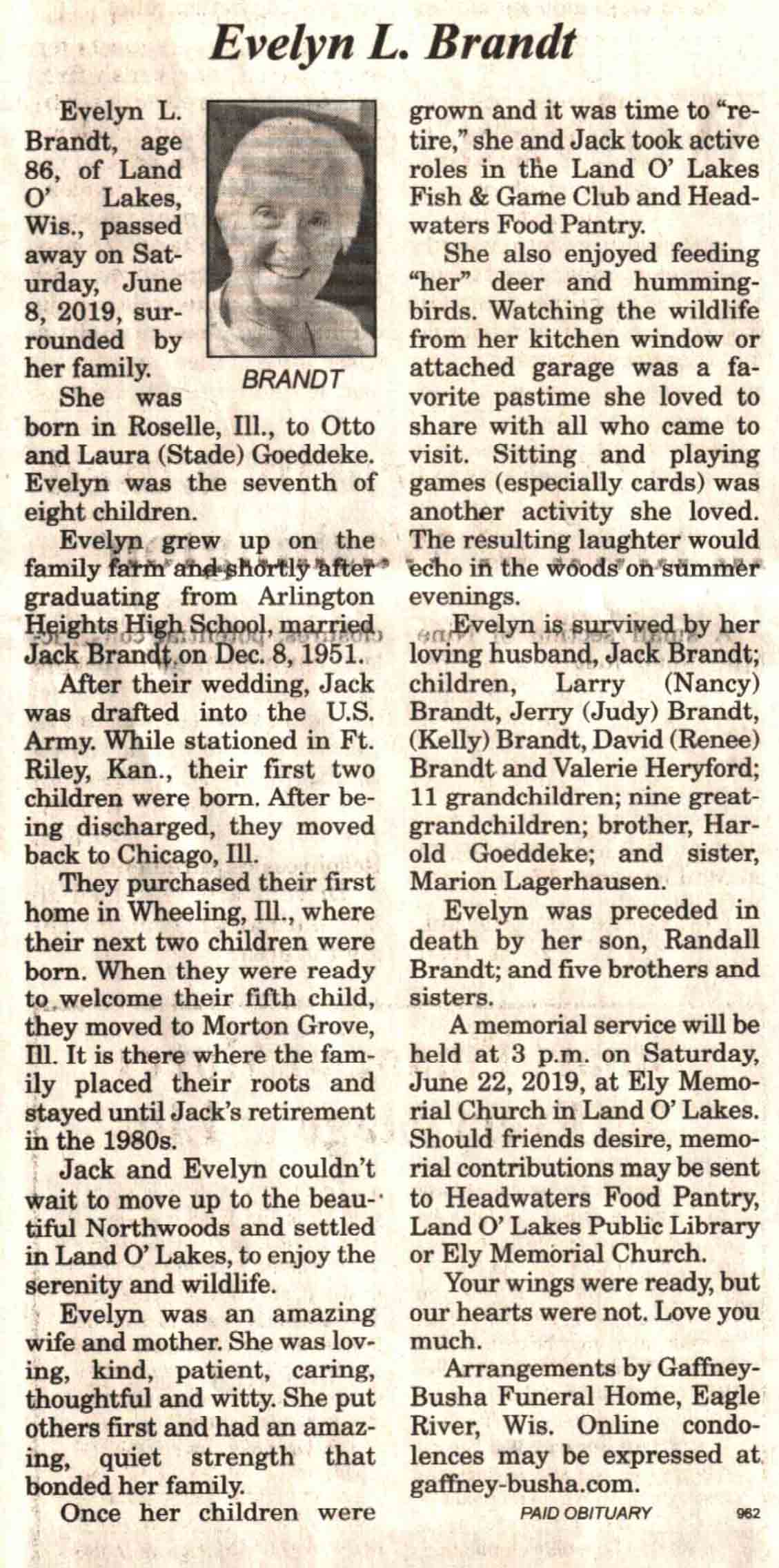 | Brandt | Evelyn L (Goeddeke) | c 1933 | 08 Jun 2019 | V-NR | 19 Jun 2019 | 4A |