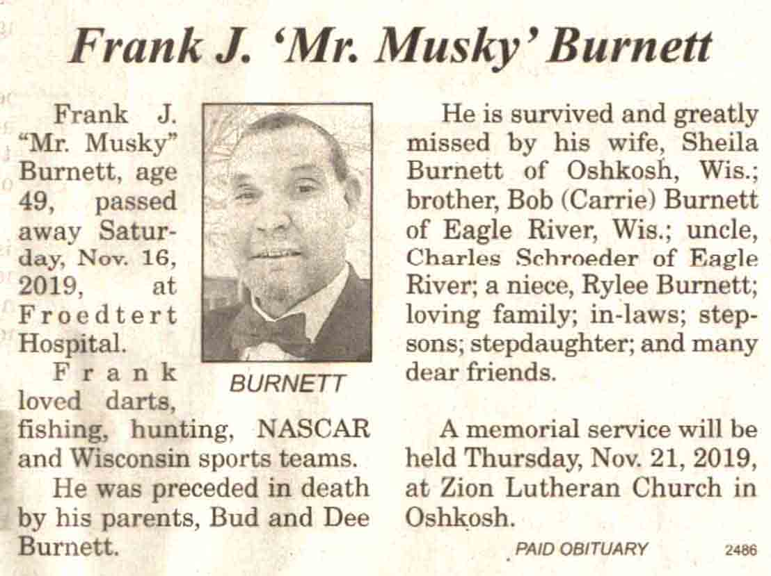 | Burnett | Frank J 'Mr. Musky' | c 1970 | 16 Nov 2019 | V-NR | 20 Nov 2019 | 4A |