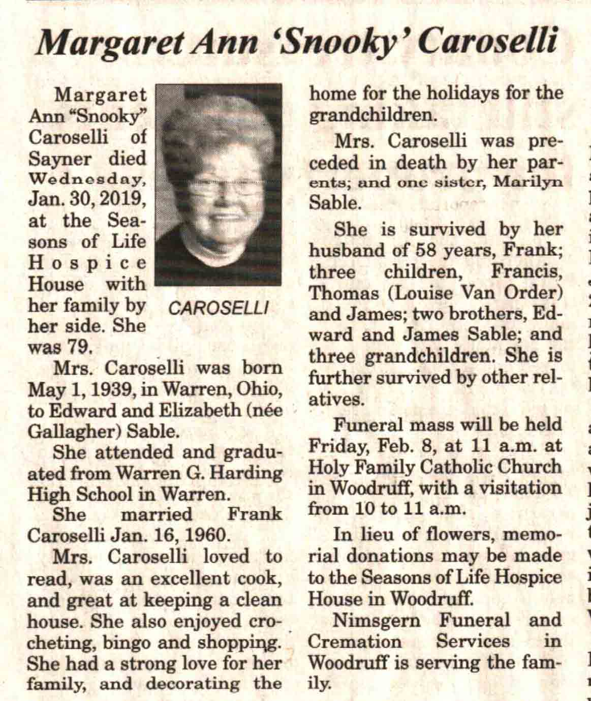 | Caroselli | Margaret Ann 'Snooky' (Sable) | 01 May 1939 | 30 Jan 2019 | V-NR | 06 Feb 2019 | 4A |