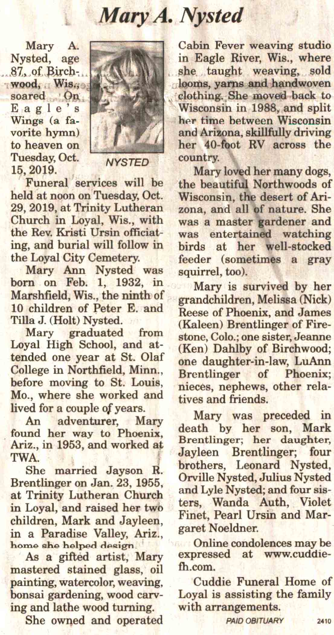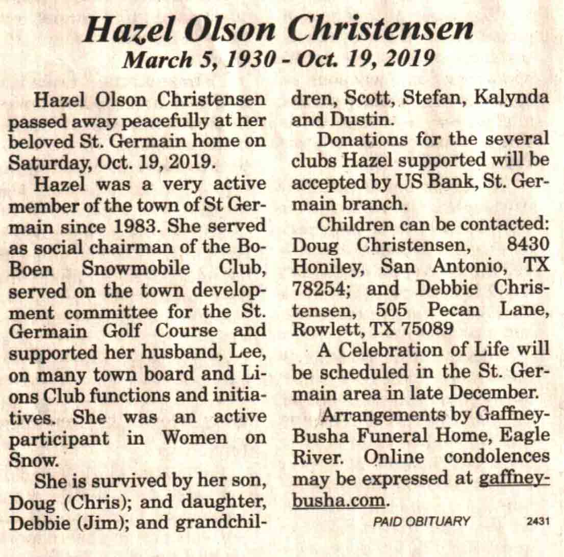 | Christensen | Hazel Olson #1 | 05 Mar 1930 | 19 Oct 2019 | V-NR | 30 Oct 2019 | 4A |