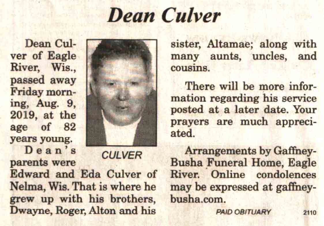 | Culver | Dean #2 | c 1937 | 09 Aug 2019 | V-NR | 21 Aug 2019 | 4A |