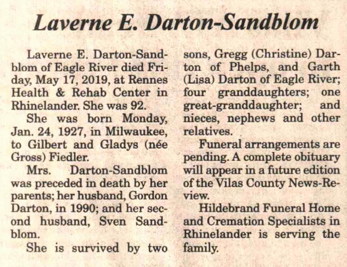 | Darton-Sandblom | Laverne E (Fiedler) #1 | 24 Jan 1927 | 17 May 2019 | V-NR | 22 May 2019 | 4A |