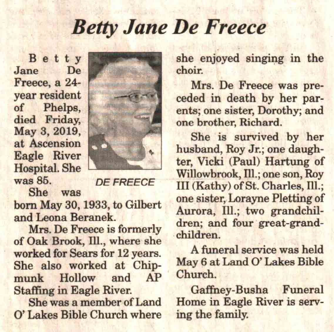 | De Freece | Betty Jane (Beranek) | 30 May 1933 | 03 May 2019 | V-NR | 08 May 2019 | 4A |