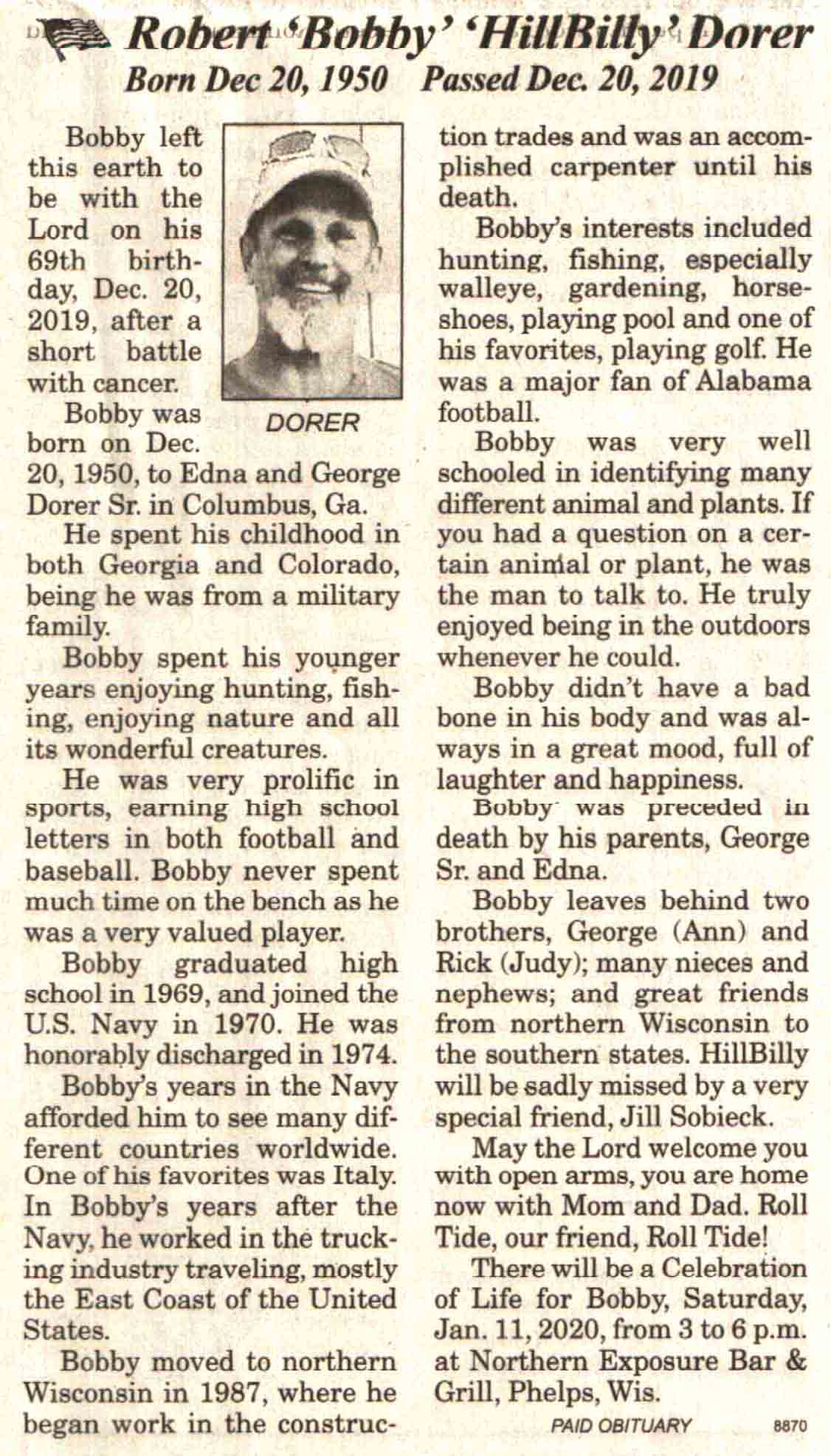 | Dorer | Robert 'Bobby' 'Hillbilly' | 20 Dec 1950 | 20 Dec 2019 | V-NR | 08 Jan 2020 | 4A |