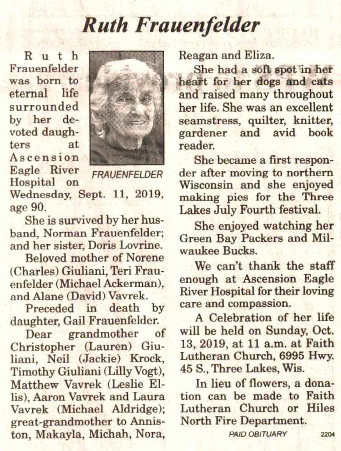 | Coda | Ruth Luella (Tews) | 14 Oct 1931 | 19 Jan 2019 | V-NR | 23 Jan 2019 | 6A |