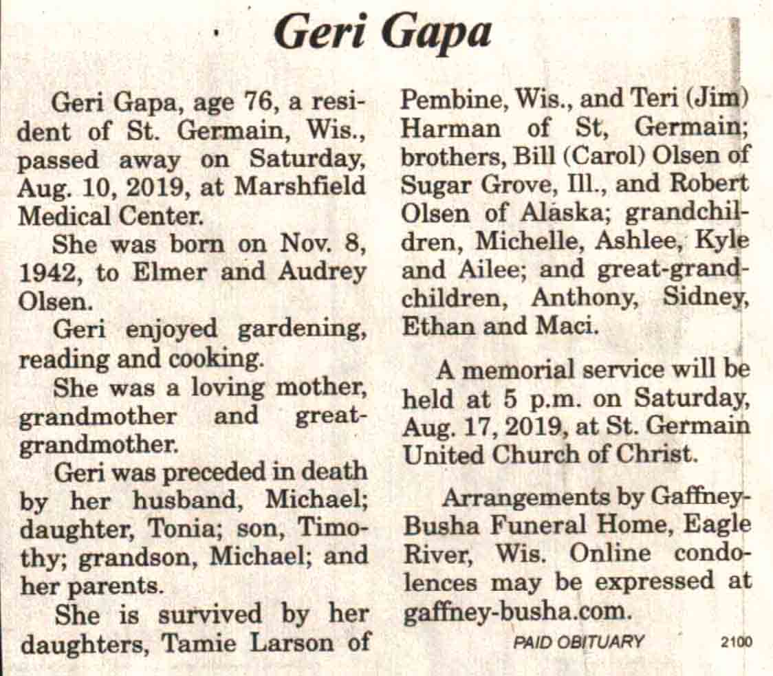 | Zellmer | Margaret G 'Margie' (Wiertz) | 21 Oct 1948 | 28 Dec 2019 | V-NR | 08 Jan 2020 | 6A |