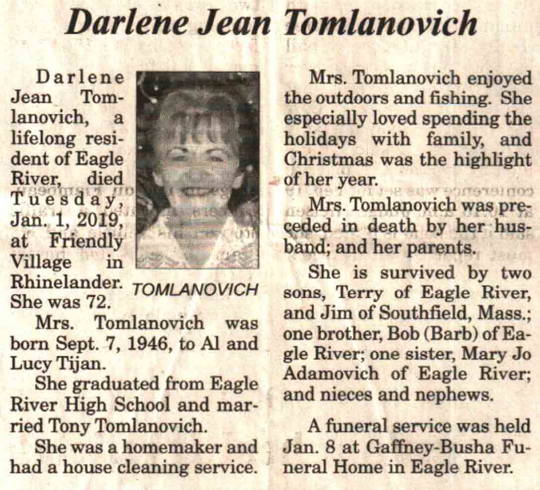 | Tomlanovich | Darlene Jean (Tijan) | 07 Sep 1946 | 01 Jan 2019 | V-NR | 09 Jan 2019 | 4A |