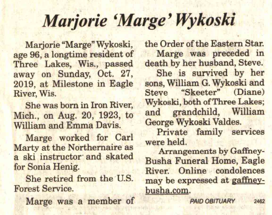 | Wykoski | Marjorie 'Marge' (Davis) | 20 Aug 1923 | 27 Oct 2019 | V-NR | 13 Nov 2019 | 4A |