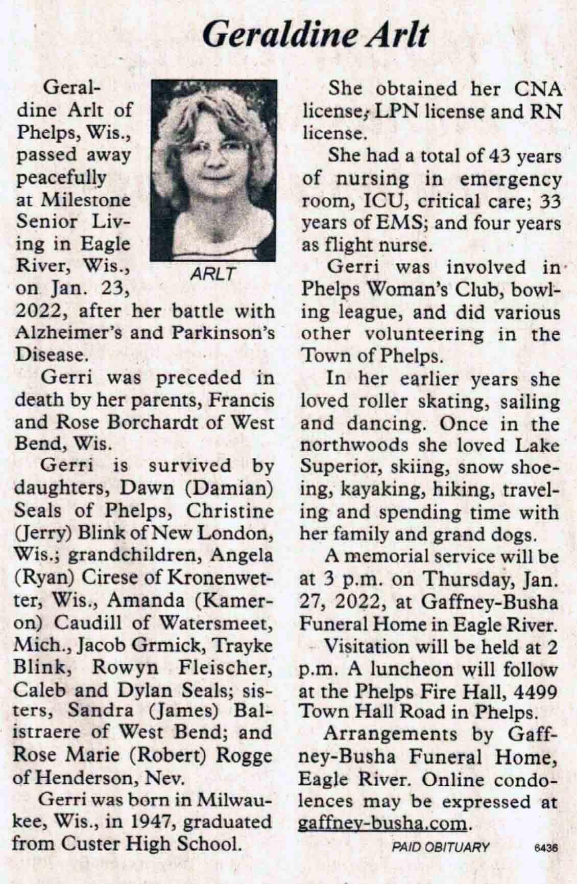 | Arlt | Geraldine (Borchardt) | 1947 | 23 Jan 2022 | VCNR | 26 Jan 2022 | 4A |