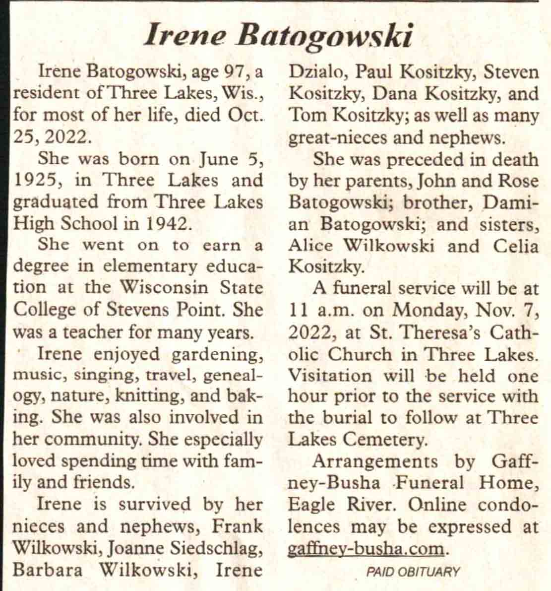 | Batogowski | Irene | 05 Jun 1925 | 25 Oct 2022 | VCNR | 02 Nov 2022 | 4A |