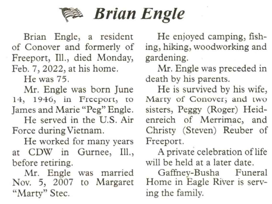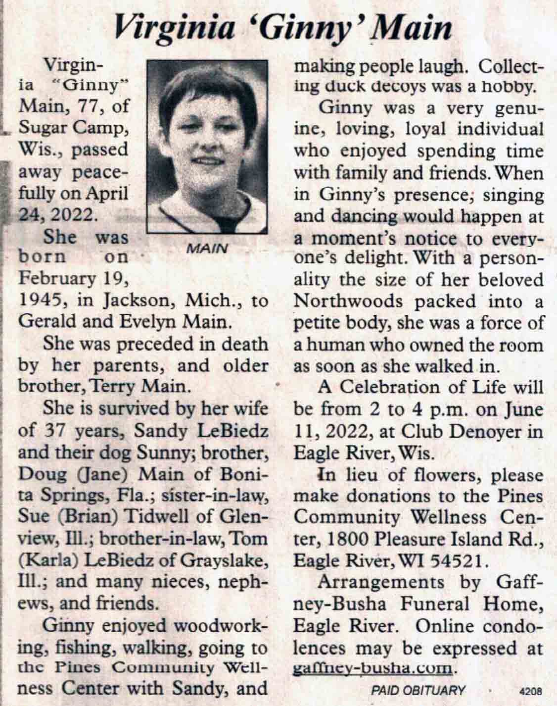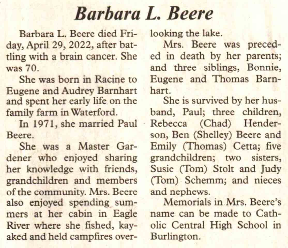 | Beere | Barbara L (Barnhart) | c 1952 | 29 Apr 2022 | VCNR | 15 Jun 2022 | 4A |