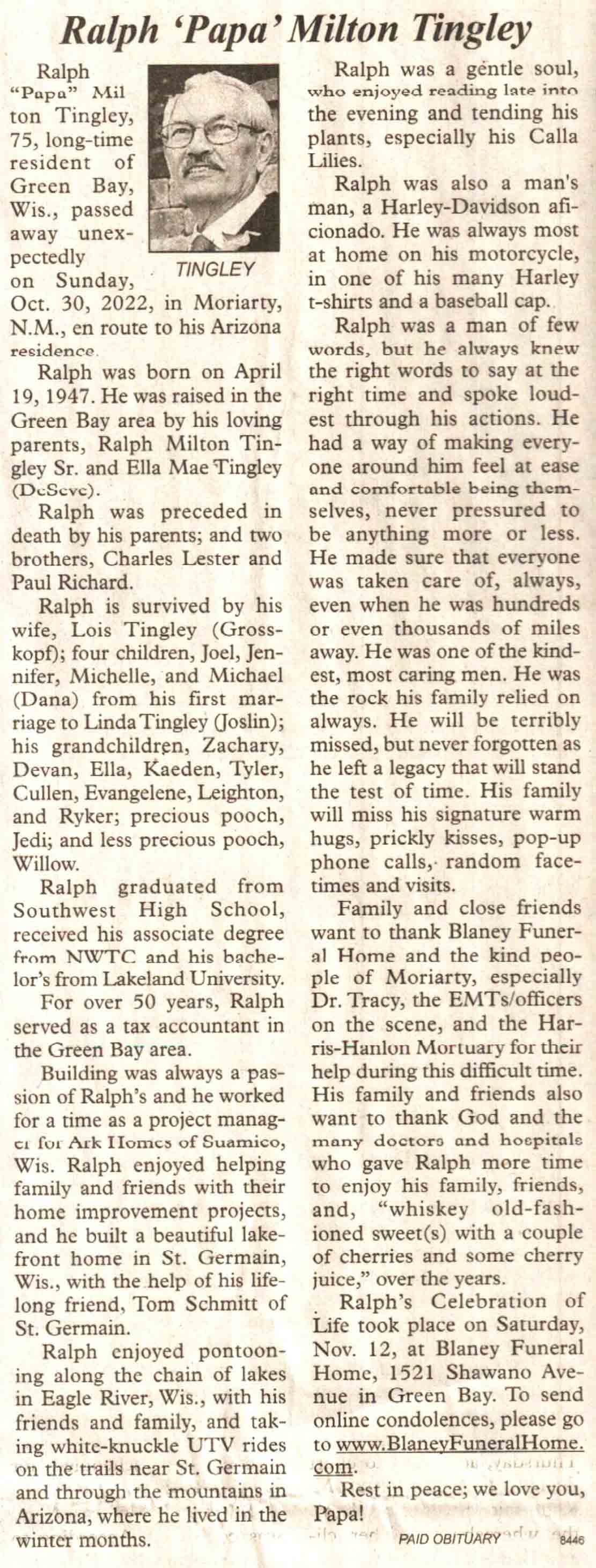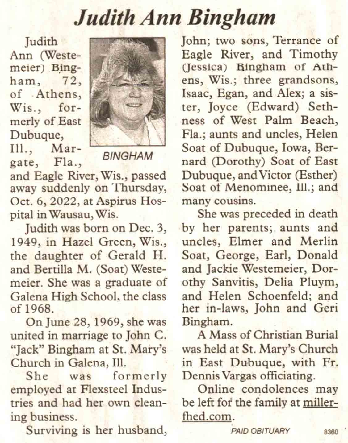 | Bingham | Judith Ann (Westemeier) | 03 Dec 1949 | 06 Oct 2022 | VCNR | 12 Oct 2022 | 4A |