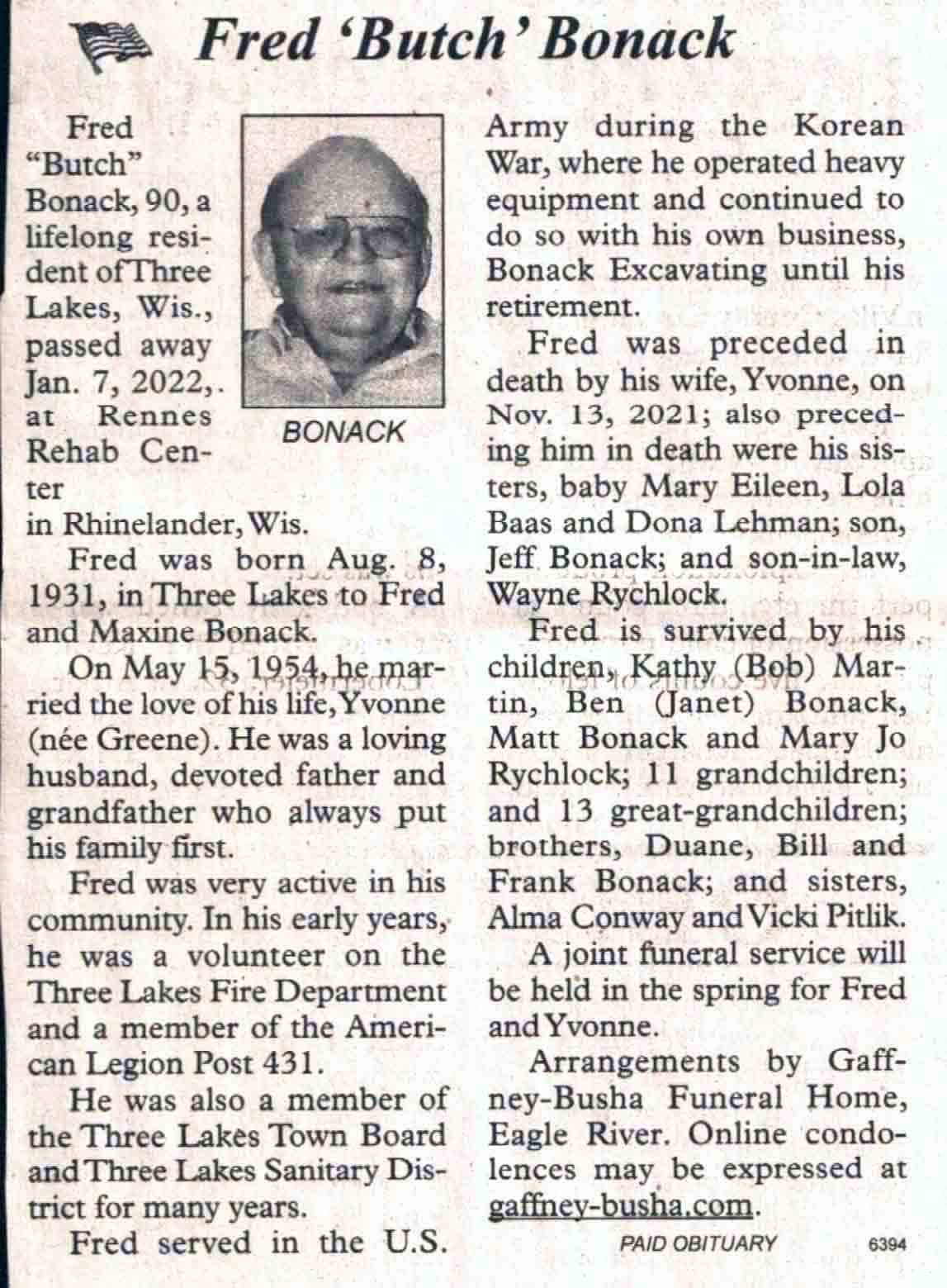| Bonack | Fred 'Butch' | 08 Aug 1931 | 07 Jan 2022 | VCNR | 12 Jan 2022 | 8A |