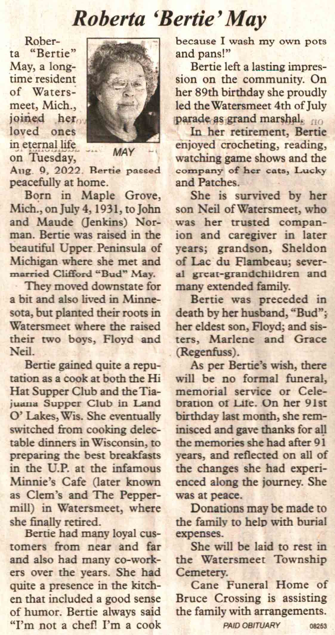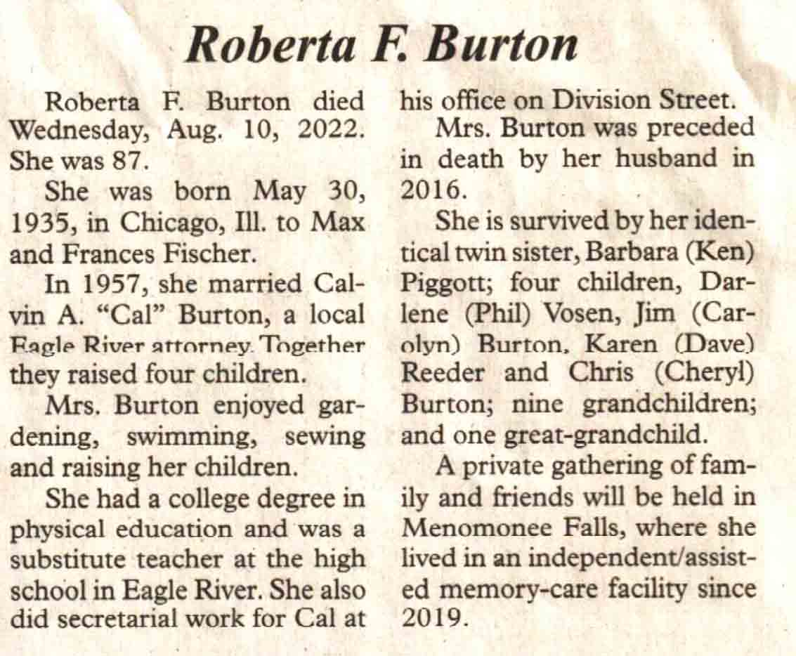 | Burton | Roberta F (Fischer) | 30 May 1935 | 10 Aug 2022 | VCNR | 17 Aug 2022 | 4A |