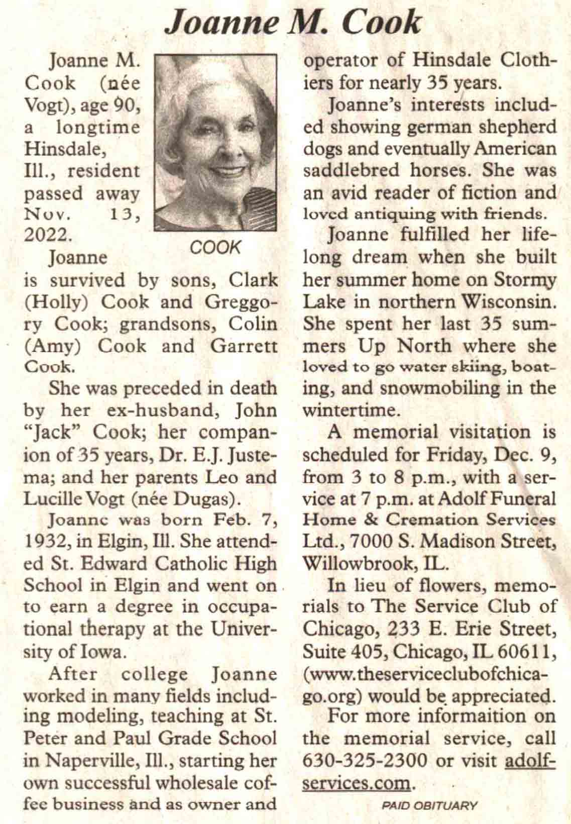 | Cook | Joanne M (Vogt) | c 1932 | 13 Nov 2022 | VCNR | 30 Nov 2022 | 4A |