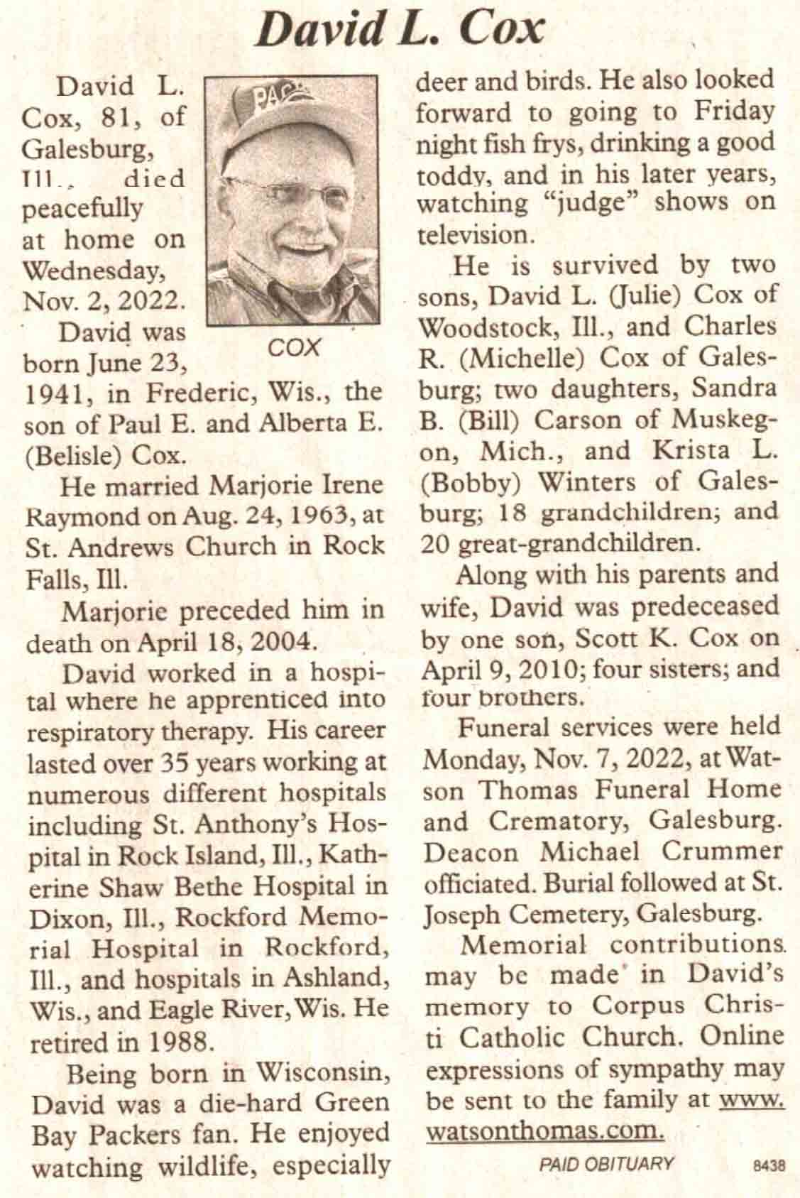 | Cox | David L | 23 Jun 1941 | 02 Nov 2022 | VCNR | 09 Nov 2022 | 4A |