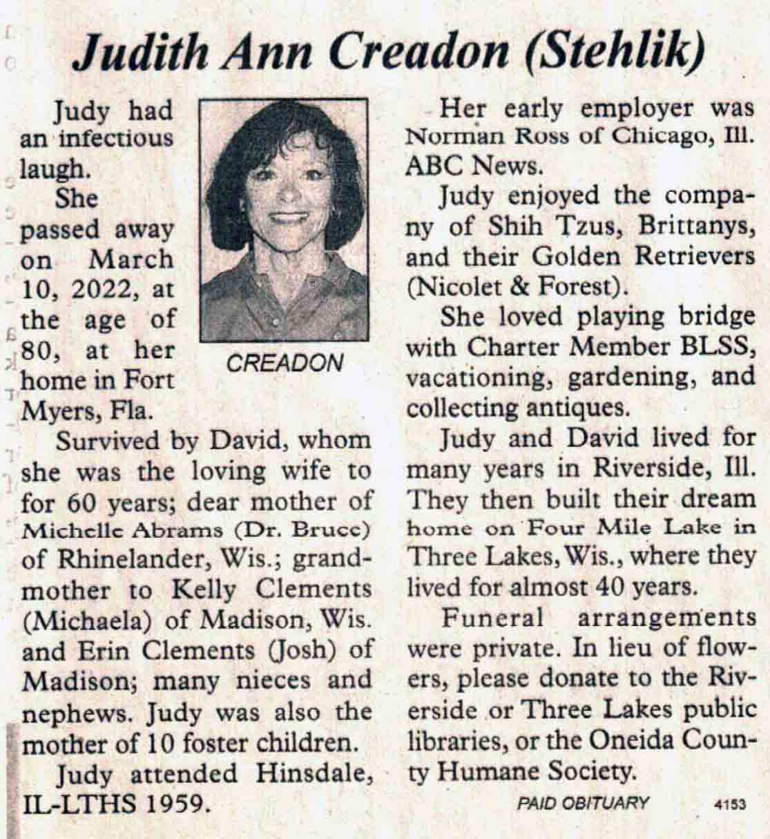 | Creadon | Judith Ann (Stehlik) | c 1942 | 10 Mar 2022 | VCNR | 13 Apr 2022 | 4A |