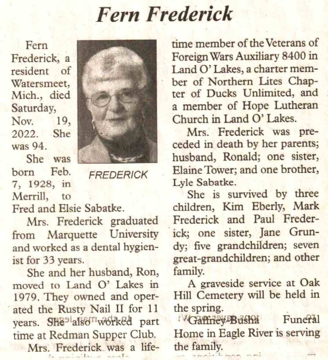 | Frederick | Fern (Sabatke) | 07 Feb 1928 | 19 Nov 2022 | VCNR | 30 Nov 2022 | 4A |