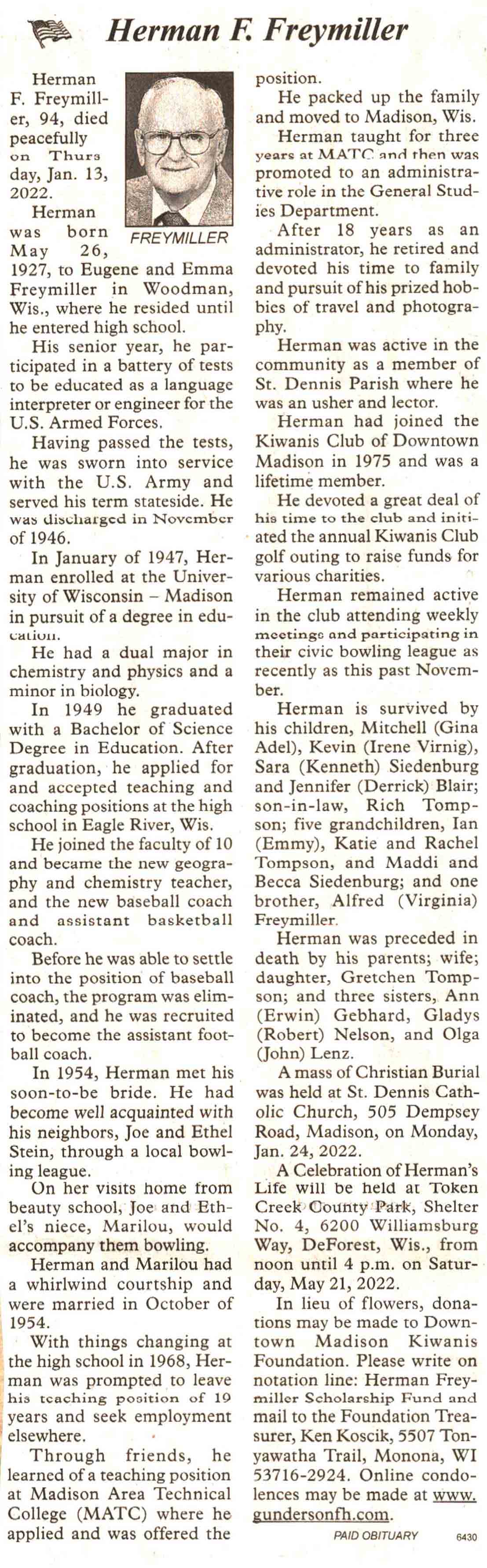 | Freymiller | Herman F | 26 May 1927 | 13 Jan 2022 | VCNR | 26 Jan 2022 | 4A |