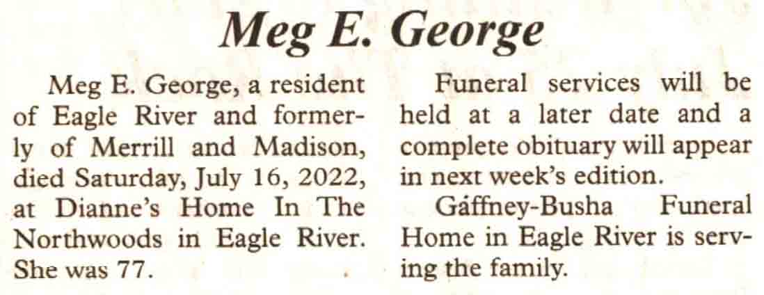 | George | Meg E (Weisser) #2 | 17 Mar 1945 | 16 Jul 2022 | VCNR | 27 Jul 2022 | 4A |