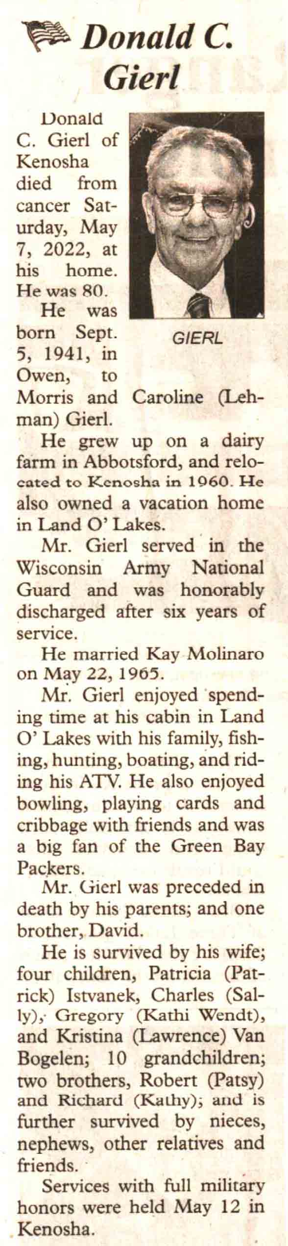 | Gierl | Donald C | 05 Sep 1941 | 07 May 2022 | VCNR | 06 Jul 2022 | 4A |