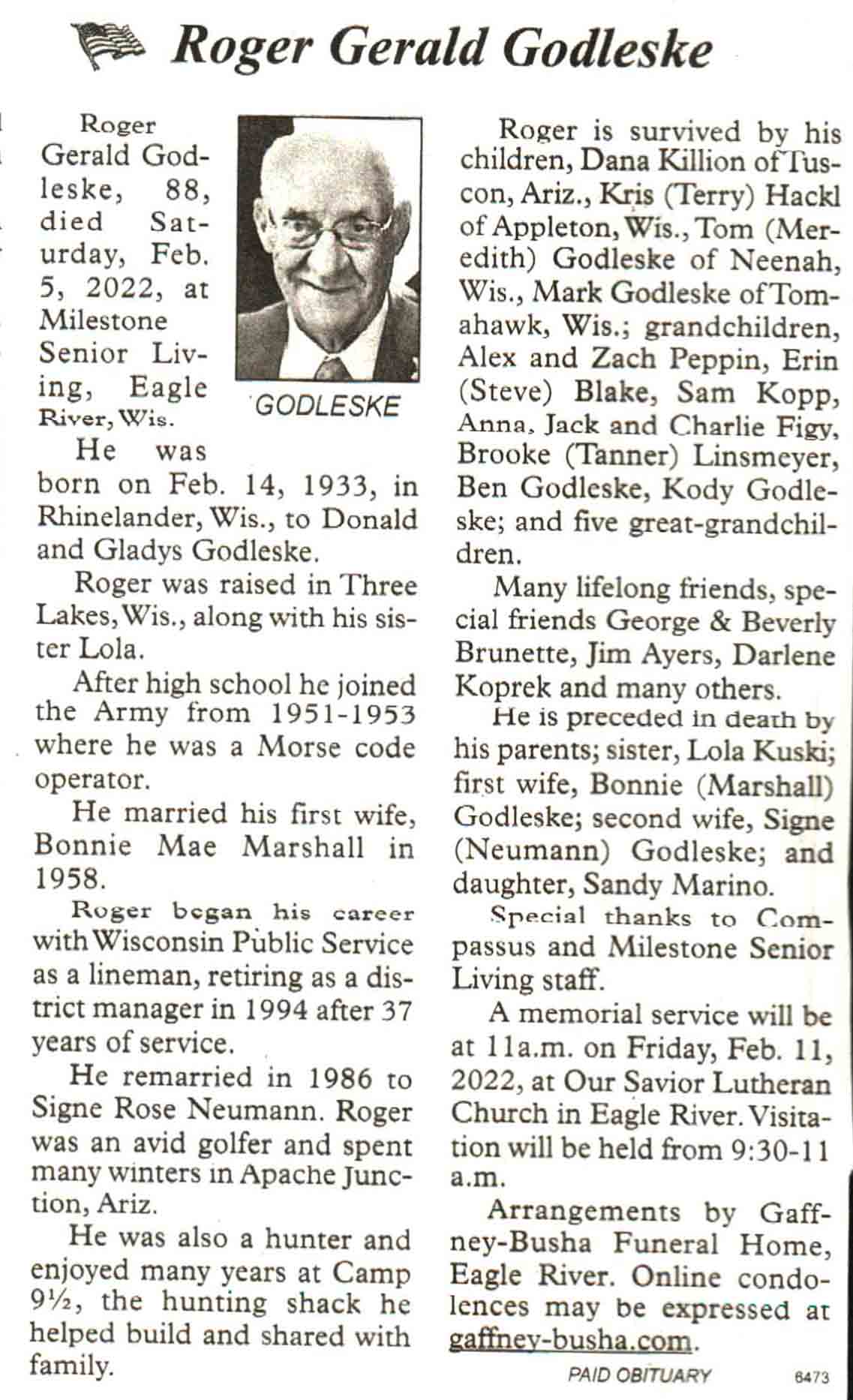| Godleske | Roger Gerald #1 | 14 Feb 1933 | 05 Feb 2022 | VCNR | 09 Feb 2022 | 4A |